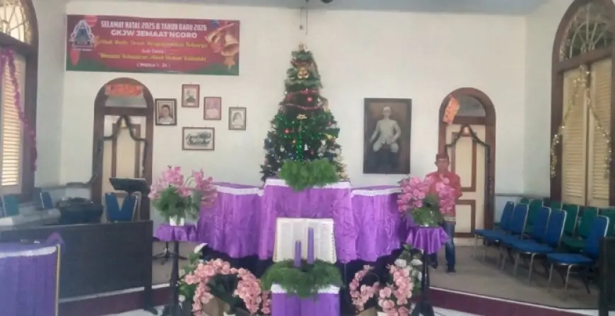 (Suasana dalam Gereja Kristen Jawi Wetan (GKJW) Persamuan Ngoro, Jombang, Jawa Timur sambut Natal 2025)