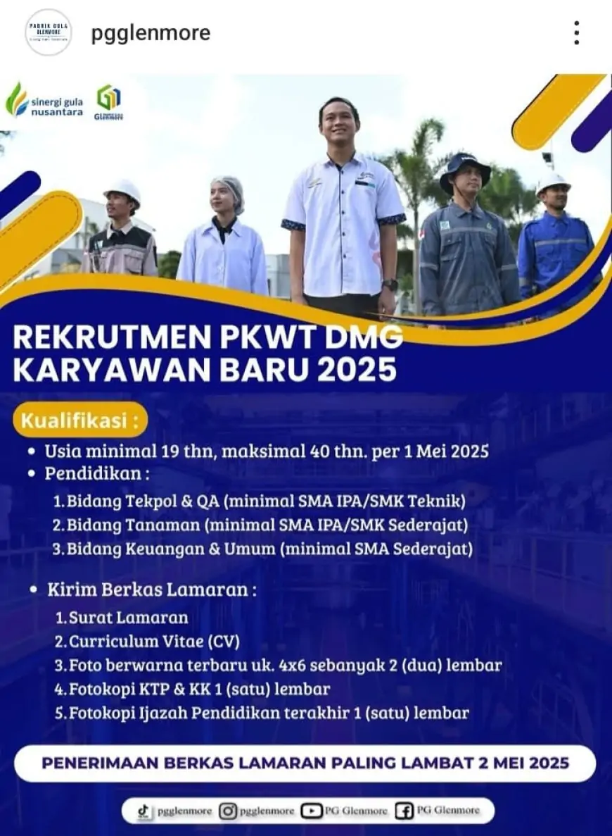Sementara itu, Humas PG Glenmore, Muhamad Shoim, menjelaskan bahwa pelamar harus berusia antara 19 hingga 40 tahun per 1 Mei 2025. Adapun rincian kualifikasi pendidikan sebagai berikut:
