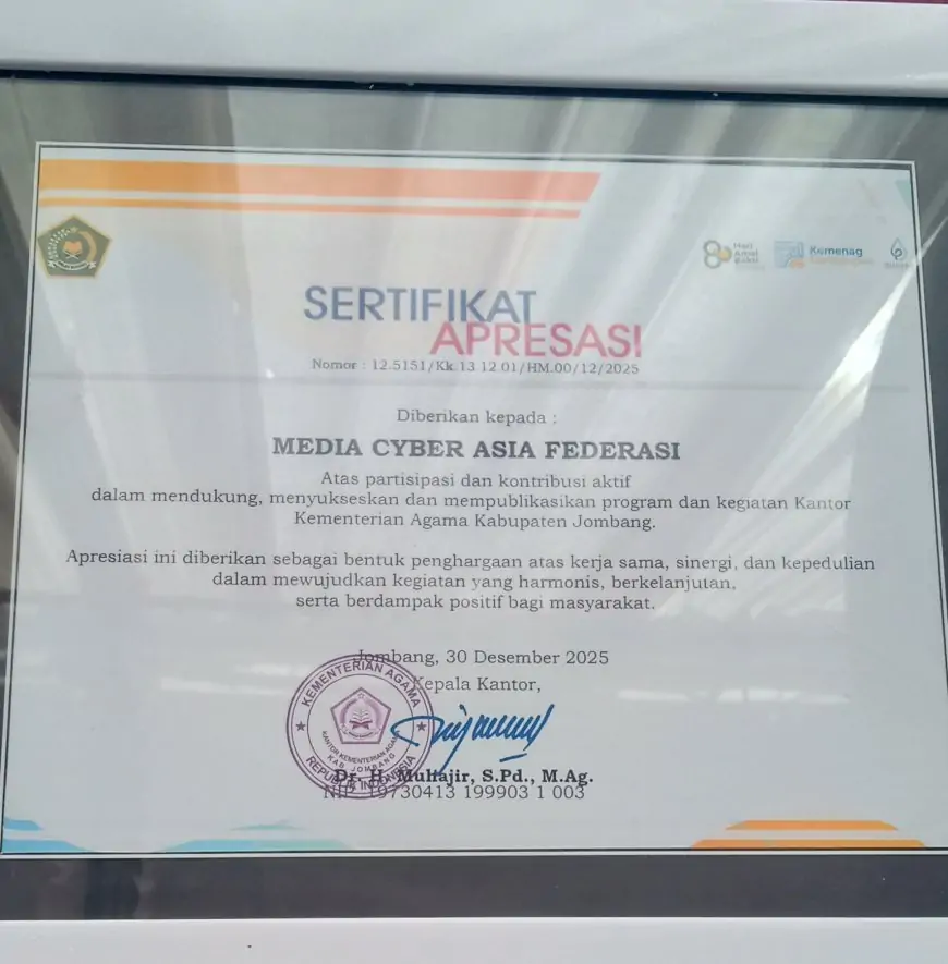 Jombang, (afederasi.com) - Dalam puncak peringatan Hari Amal Bhakti (HAB) ke-80 Kementerian Agama Republik Indonesia, Media Afederasi dan Dinas Lingkungan Hidup Kabupaten Jombang mendapatkan kehormatan menerima penghargaan khusus dari Kantor Kementerian Agama (Kemenag) Kabupaten Jombang, Sabtu (03/01/2026).