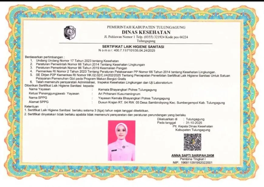 Sertifikat dengan Nomor 400.7.11/7101/35.04.24/2025 diterbitkan pada 31 Oktober 2025. Pengakuan tersebut menandakan bahwa dapur pengolahan milik Polres Tulungagung telah memenuhi standar kelayakan sanitasi dan keamanan pangan sesuai ketentuan yang berlaku.